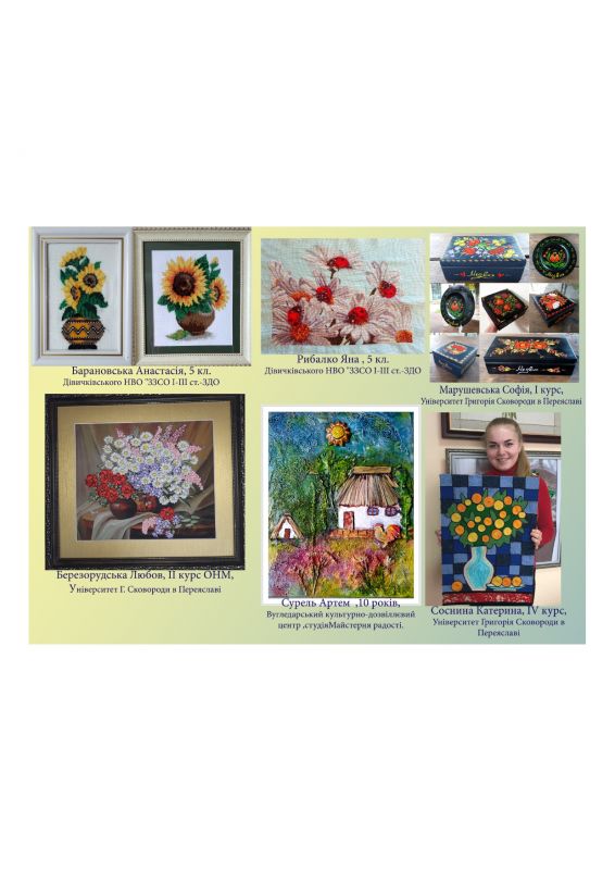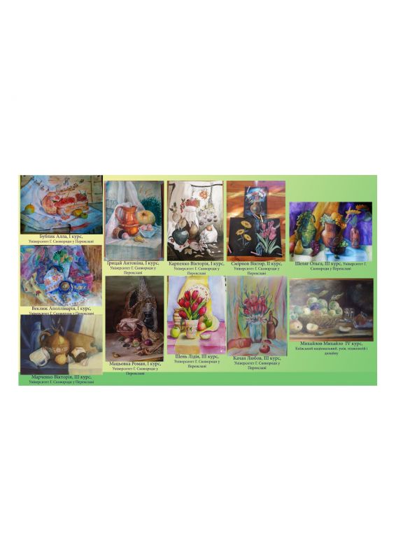 Як повідомлялося на сайті педагогічного факультету на початку травня, усіх юних художників і тих, хто бажає ними стати (від школярів молодших класів до студентів вишу – прим.авт.) було запрошено взяти участь у дистанційному творчому конкурсі малюнків і декоративних композицій на тему «Весняний натюрморт з елементами народності», що проходив у рамках VIІ Міжнародного полікультурного фестивалю-конкурсу «Переяславський дивограй – 2020». Конкурс добіг свого завершення, і ми з радістю констатуємо, що в ньому взяли участь 27 учасників з різних куточків Київщини, міста Переяслава, Білої Церкви, ЗЗСО переяславського району.