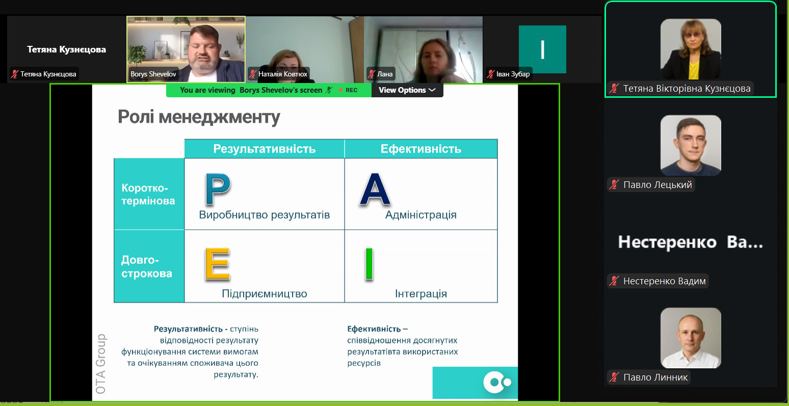 У ході навчальної зустрічі здобувачі навчилися аналізувати організаційні структури, діагностувати «аномальні проблеми» розвитку, оцінювати ролі керівників за моделлю PAEI та розмежовувати результативність і ефективність як ключові параметри стійкості бізнесу. Такі практичні навички допомогли їм побачити ризики бюрократизації, надмірної концентрації влади чи втрати гнучкості та визначити можливі шляхи їх подолання. Це підтвердило програмні результати навчання – застосування теорії менеджменту на практиці, пошук рішень у кризових ситуаціях і розуміння глибинних причинно-наслідкових зв’язків у розвитку підприємств.