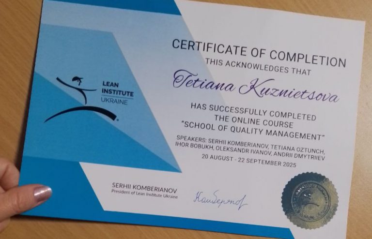 Викладач Тетяна Кузнєцова успішно пройшла програму професійного розвитку «School of Quality Management» на базі Lean Institute Ukraine