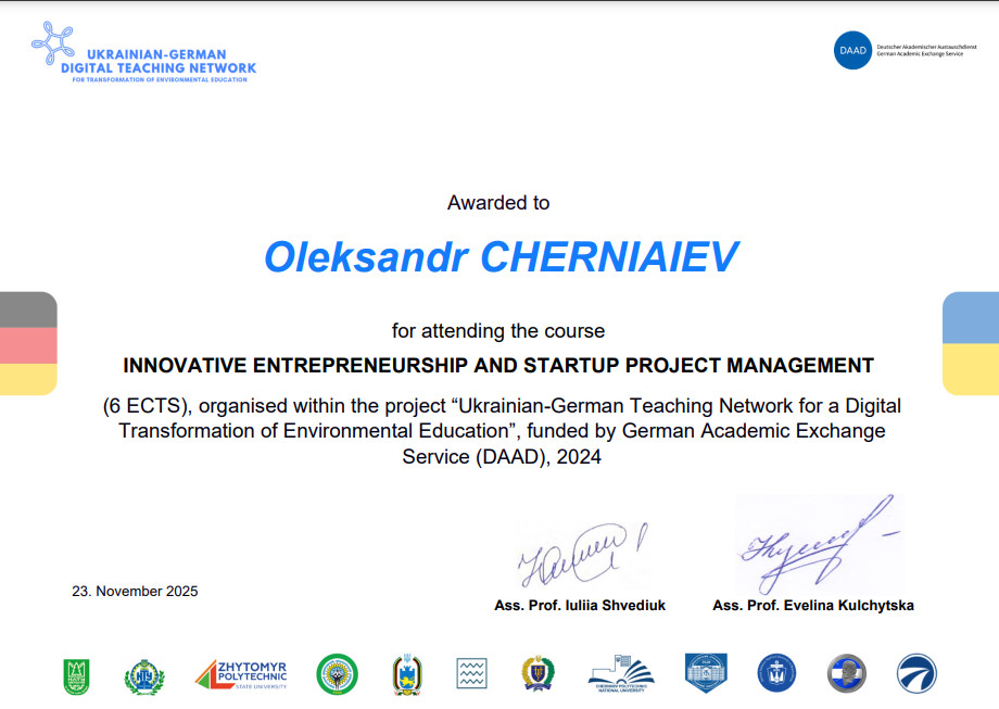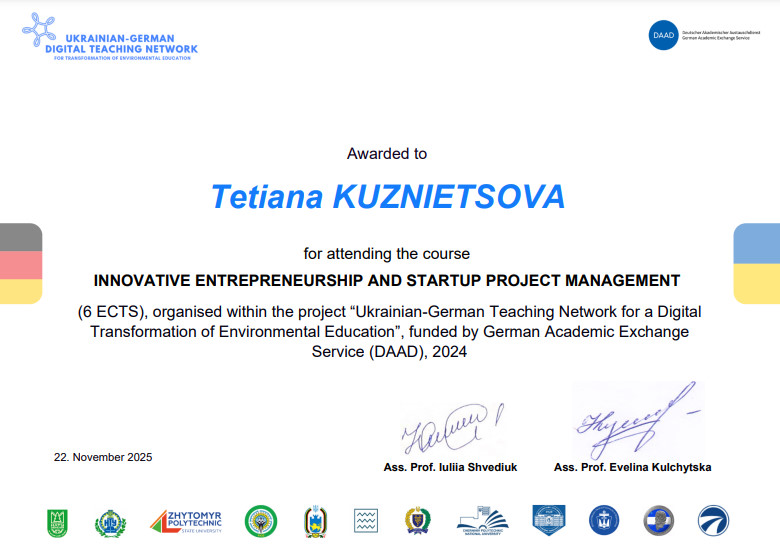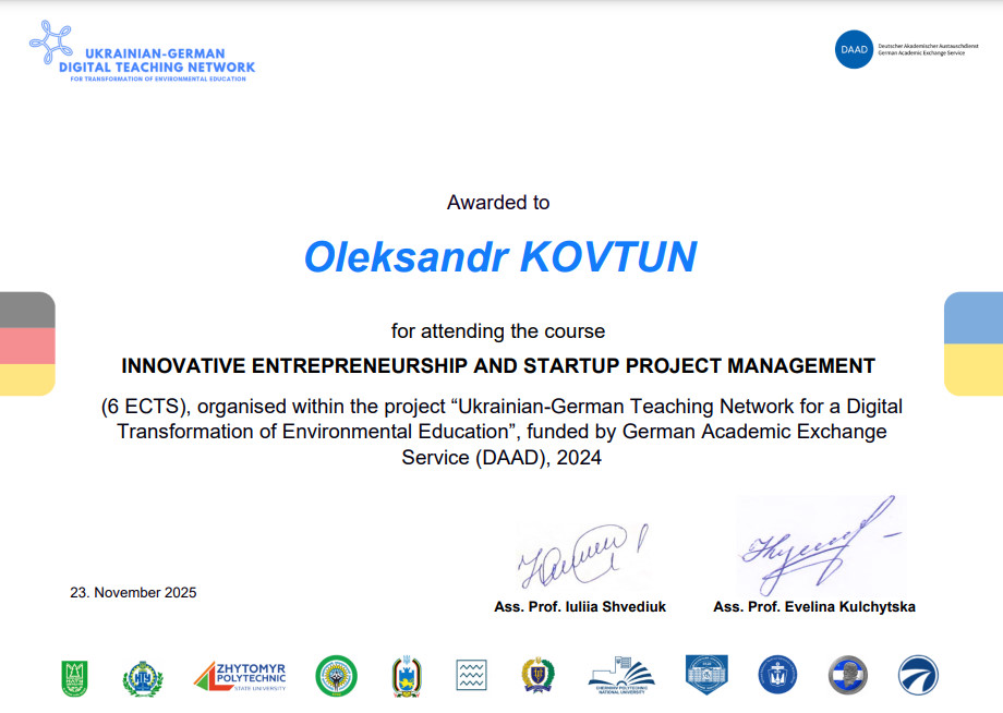 Викладачі кафедри менеджменту ФММПП УГСП Олександр Ковтун, Євген Кузнєцов, Тетяна Кузнєцова й Олександр Черняєв, успішно завершили річне міжнародне стажування на українсько-німецькій цифровій платформі в межах проєкту «Ukrainian-German Teaching Network for a Digital Transformation of Environmental Education» за програмою «Innovative Entrepreneurship and Startup Project Management» обсягом 6 кредитів ЄКТС.