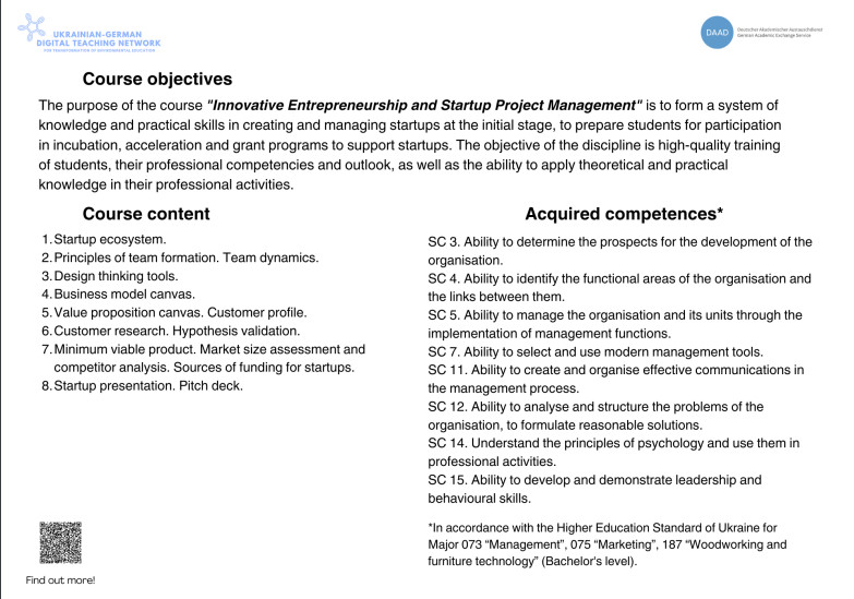 Учасники розвинули глибокі компетентності з інноваційного підприємництва, сучасних підходів до управління стартапами, моделювання бізнес-процесів, ризик-менеджменту та цифрової підтримки управлінських рішень. Завдяки цьому викладачі значно розширили інструментарій для підготовки здобувачів вищої освіти спеціальності «Менеджмент» до успішної діяльності в умовах цифрової економіки, високої конкуренції та стрімких змін ринкових моделей.
