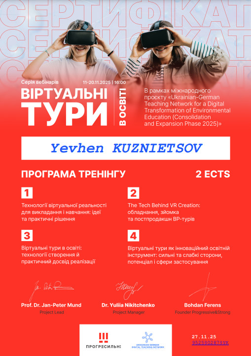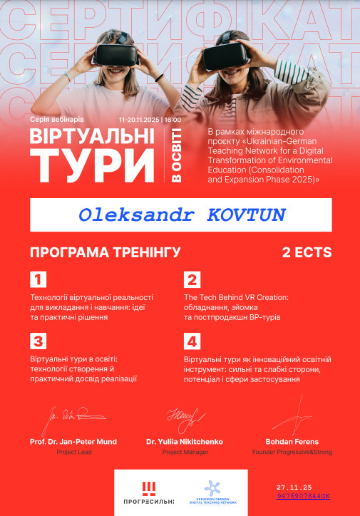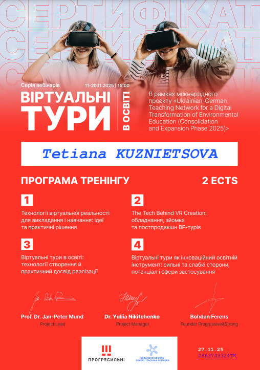 У листопаді 2025 року, на цій же українсько-німецькій освітній платформі, ці ж викладачі доєдналися до серії професійних вебінарів «Віртуальні тури в освіті» (11-20 листопада), обсягом 2 кредити ЄКТС, що охопили сучасні VR-технології та можливості створення віртуальних турів в освітньому середовищі. Учасники не лише ознайомилися з принципами побудови імерсивних 3D-просторів, а й здобули практичні навички у проєктуванні власних VR-турів – від вибору обладнання та технік зйомки до монтажу й інтеграції в освітні курси. Цей досвід дозволить викладачам впроваджувати інноваційні форми навчання, що сприятимуть розвиткові критичного мислення, зануренню у складні управлінські ситуації та створенню віртуальних бізнес-симуляцій для майбутніх менеджерів.