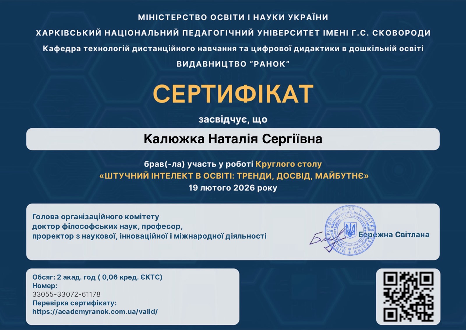 19 лютого 2026 року у межах діяльності освітньо-наукового хабу «Стартап-Бізнес-Менеджмент» факультету мистецтва, менеджменту, педагогіки і психології Університету Григорія Сковороди в Переяславі на платформі Академії «Ранок», за участі Харківського національного педагогічного університету імені Г.С. Сковороди, відбувся всеукраїнський круглий стіл «Штучний інтелект в освіті: тренди, досвід, майбутнє».