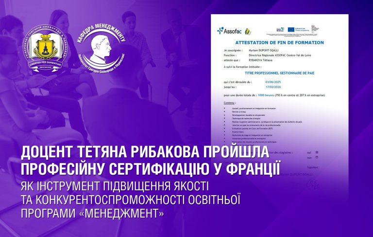 Доцент Тетяна Рибакова пройшла професійну сертифікацію у Франції як інструмент підвищення якості та конкурентоспроможності освітньої програми «Менеджмент»